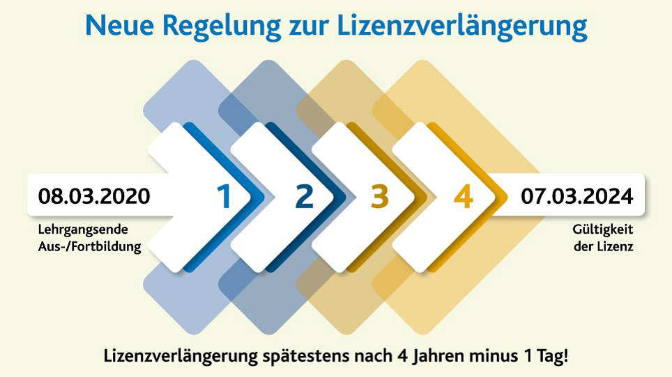 - Im zweiten und dritten Jahr nach Ablauf der Gültigkeit: Nach erfolgreichem Besuch von Fortbildungen mit einem Gesamtumfang von mindestens 30 Lizenzpunkten erfolgt eine Verlängerung um weitere vier Jahre rückwirkend zum Ablaufdatum.